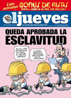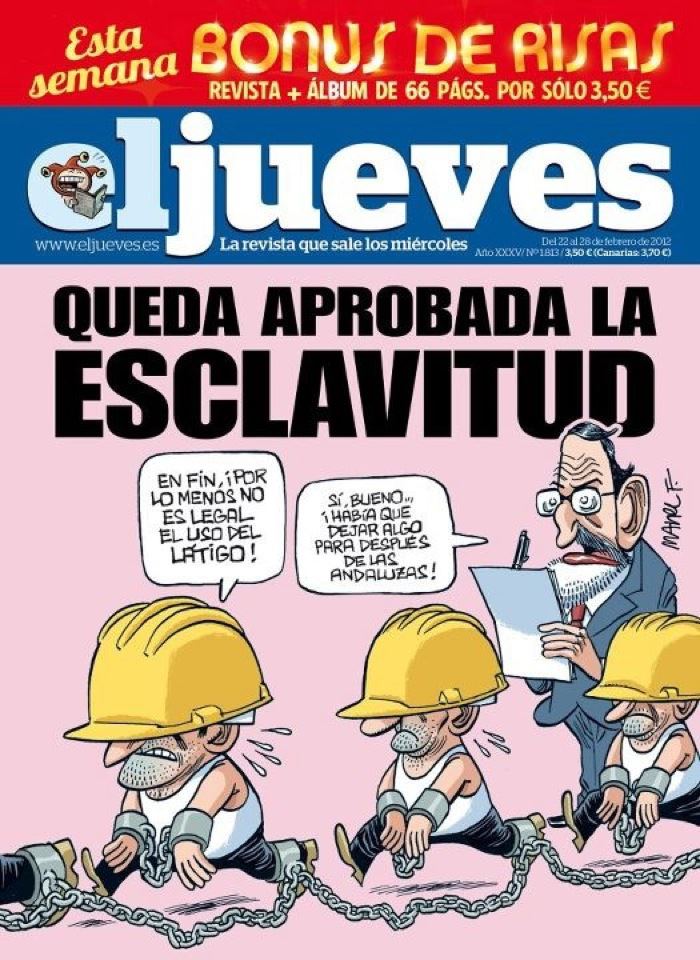 I deien q el PP era el partit de “los trabajadores”, la pregunta és els drets de quins treballadors: els amigachos, les multinacionals i la banca. Els treballadors asalariats els seus esclaus i les pymes i autònoms ofegats perquè estan parant més el mercat amb l’augment d’impostos i retallades i perquè els bancs que segueixen rebent diners del govern no donen crèdits. Amb esta política econòmica tenim crisi per a llarg: no creen riquesa i damunt fan més precaries encara les condicions laborals. Ara no seran 5 milions de parats, seran 5 milions de parats i l’augment accelerat de la pobresa a Espanya mentre ‘ells’ “se lo llevan calentito”. Si hi ha que apretar-se el cinturó, hi ha molts altres que poden apretar-se’l i Espanya eixiria d’esta: gasto militar, institucions innecesàries, cotxes oficials, dietes sense control, vols en primera classe, càrrecs duplicats, frau fiscal, sous vitalicis, financiació de despilfarros, corrupció, monarquia… No poden retallar del poc que té la majoria, dels drets fonamentals de tots segons la constitució: dret al treball, dret a una vivenda digna, dret a la sanitat i dret a l’educació pública i gratuita.